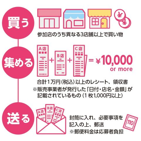 参加店舗の中から異なる3店舗以上で買い物やサービスの提供を受け、合計1万円(税込み)以上のレシートまたは領収書を集める。※1枚当たり1000円以上