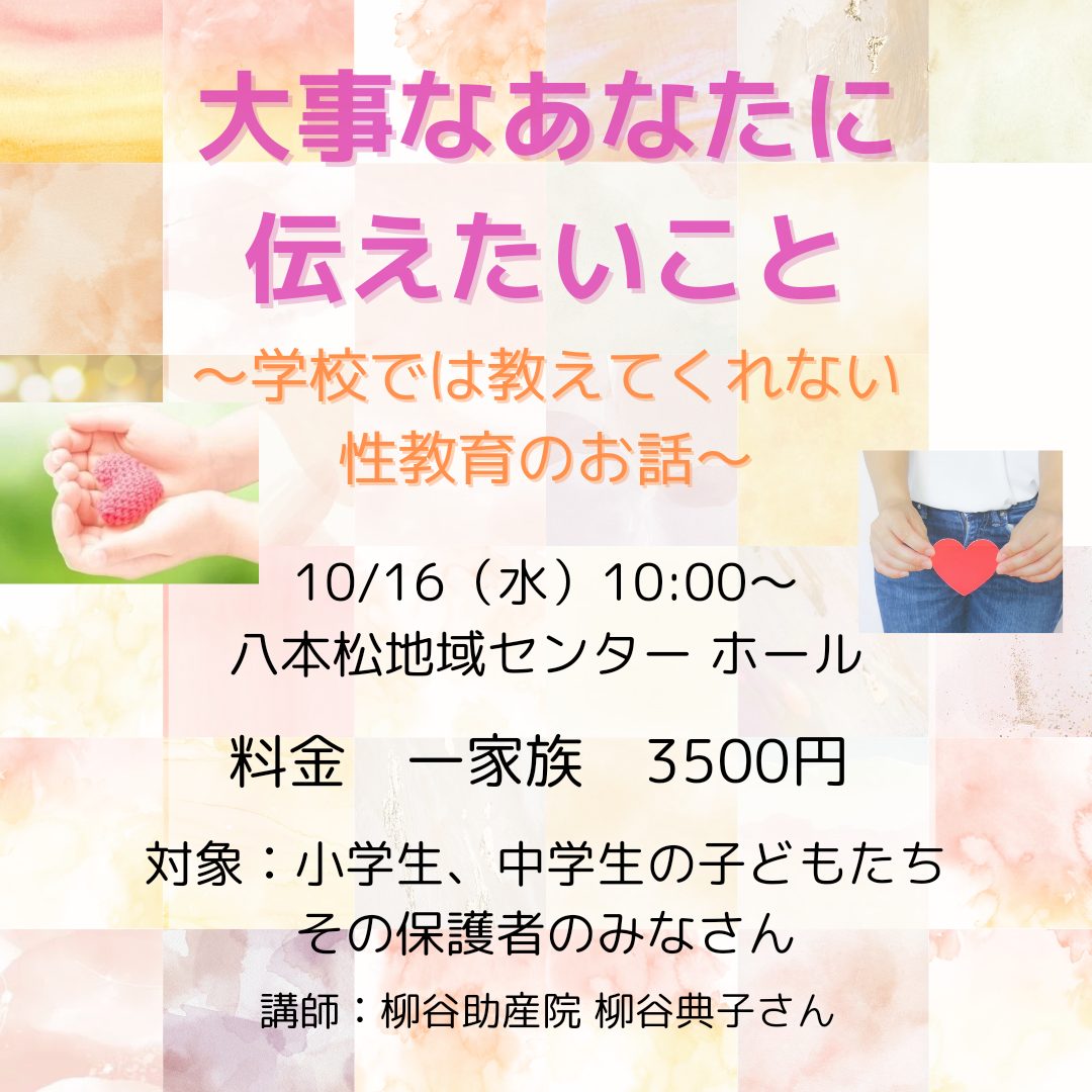 柳谷助産院の柳谷典子さんを講師に招いた性教育講座。小中学生と保護者対象。内容は生理、妊娠、出産のこと、性交の話、自分の体を大事にすることなど。参加費は1家族3500円。要予約。申し込み締め切り10月15日(火)。申し込みはこちら