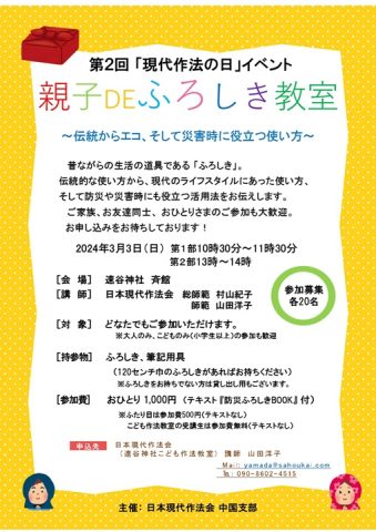 日本現代作法会中国支部は3月3日(日)、速谷神社斉館で「第2回現代作法の日イベント」として「親子DE風呂敷教室~伝統からエコ、そして災害時に役立つ使い方~」を行います。