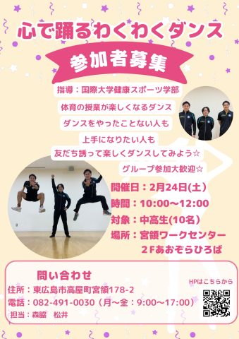 広島国際大学健康スポーツ学部の学生が指導するダンス教室「心で躍るわくわくダンス(初心者編)」が2月24日、東広島市高屋町宮領のあおぞらひろばで開かれます。