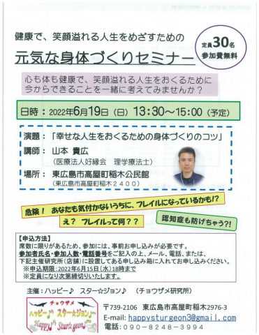 そんなハッピー♪スター☆ジョン♪がチョウザメ研究所として主催する「元気な身体づくりセミナー」が、6月19日に開催されます。