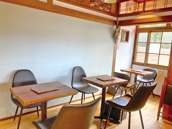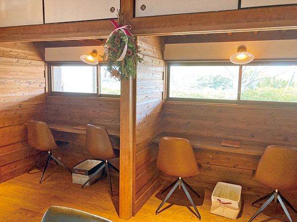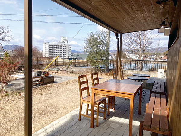 家を改築した店内は、元々あったものをうまく残しつつおしゃれにリノベーション。陶器のランプシェードは音戸に工房がある佐々木しずさん作。テラス席、窓際のカウンター席から見えるのは桜とツツジの木。花が楽しめるのはもうすぐ。
