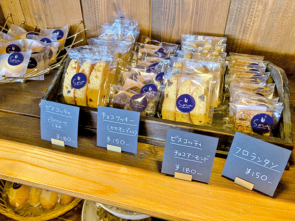 外まで香ってくるおいしそうな匂い。店内で作られているケーキやプリン、ドリンクなどはテークアウト可能で、北海道産の小麦粉やバターを使った焼き菓子はおみやげにも喜ばれそう。