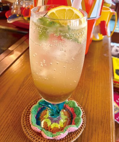 「コーラが大好きな家族のために、無添加のコーラを」と研究に1年以上かけて完成させた自家製ヌーノコーラ。コーラの実やさまざまなスパイスに大崎上島のオーガニックレモンを使用。シロップを炭酸水で割って、庭で育てているハーブと、レモンを飾ったら完成。