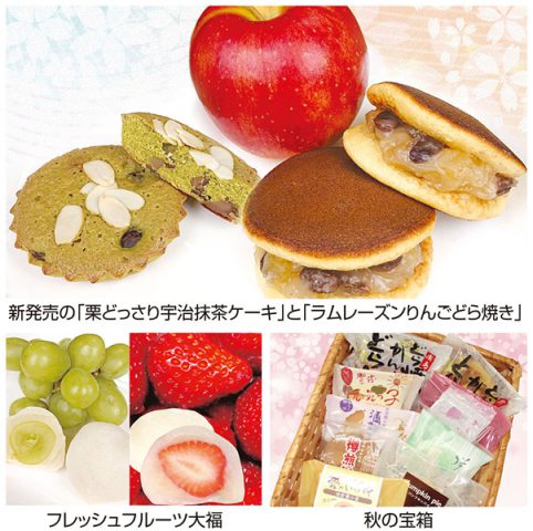 お得な商品も多数用意。人気のお菓子詰合せ「秋の宝箱」、大福4個入りを500円均一。フレッシュフルーツ大福の「いちご大福」「シャインマスカット大福」を特別価格で年内最後の限定販売。新発売「栗どっさり宇治抹茶ケーキ」「ラムレーズンりんごどら焼き」も見逃せない。