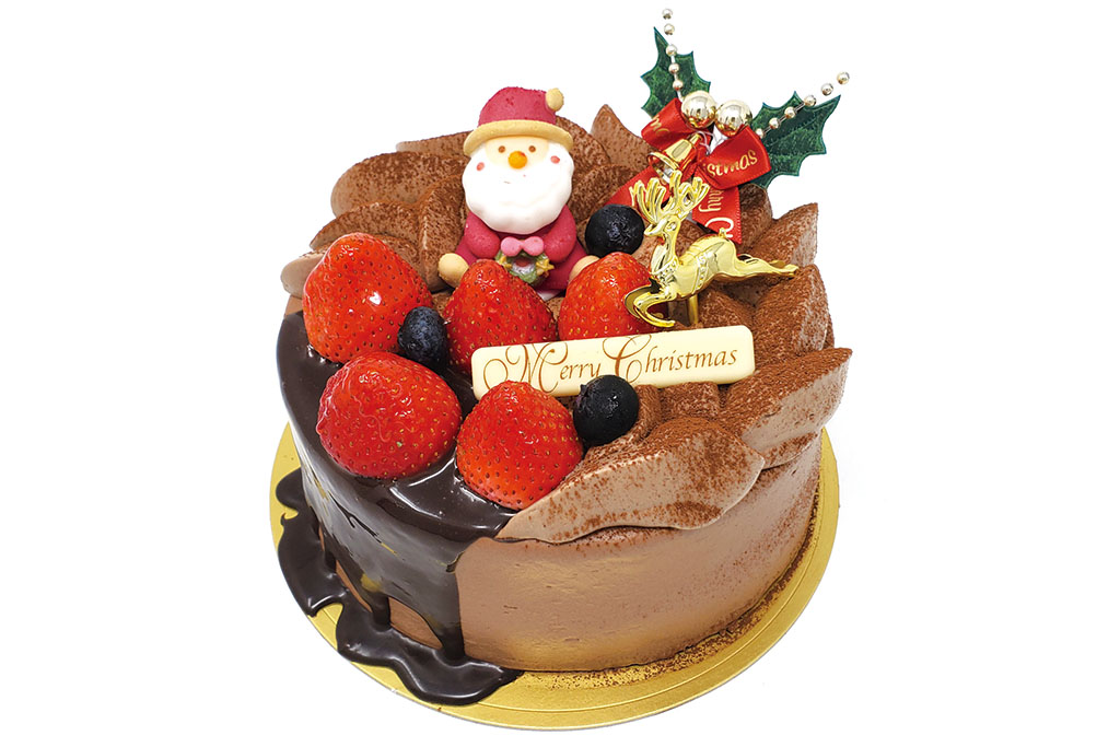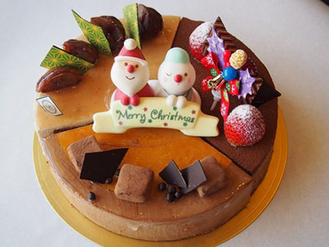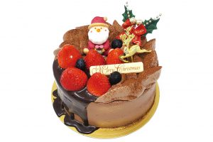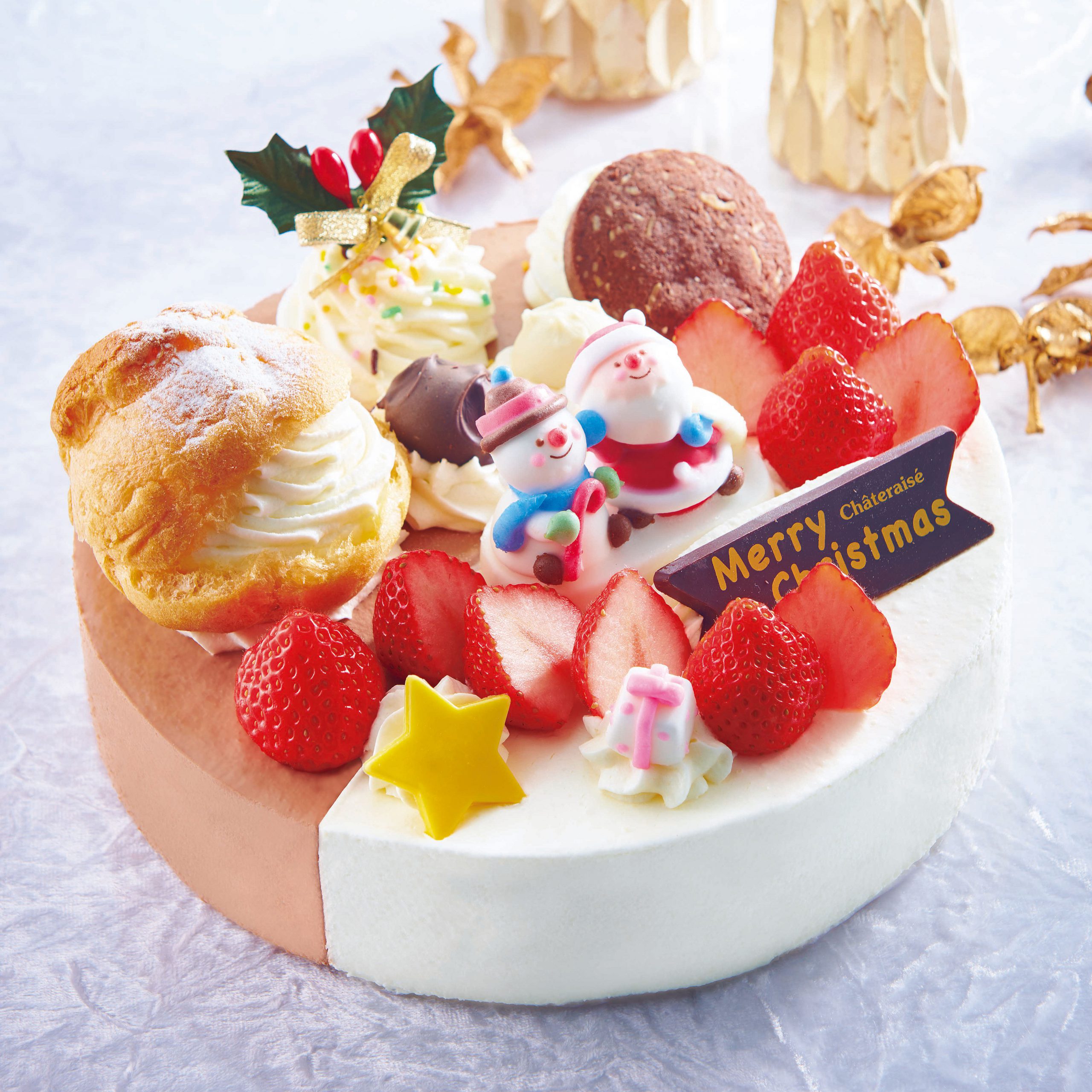 ホイップクリームとチョコクリームの2種類の味を合わせたデコレーション。雪だるまとサンタさん(砂糖菓子)、シュークリームやアーモンド入りココアクッキー、苺を飾ってかわいらしく仕上げました。5~7人向け。注文受付期間は11月12日(木)~12月25日(金)。
