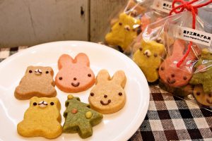 「道の駅 湖畔の里」さんとのコラボ商品。天然着色料を使った動物の形をしたクッキーです。
