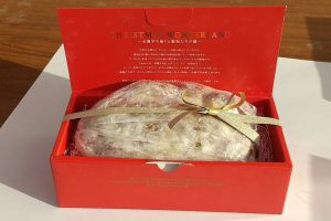 東広島市西条中央の「パティスリー・レヴェイユ・ドゥラムール」がオススメするクリスマスケーキは今年の新商品です。サイズは18㌢のみ、税抜き4200円です。やわらかしっとりの生地にパリパリのチョコがコーティングされています。
