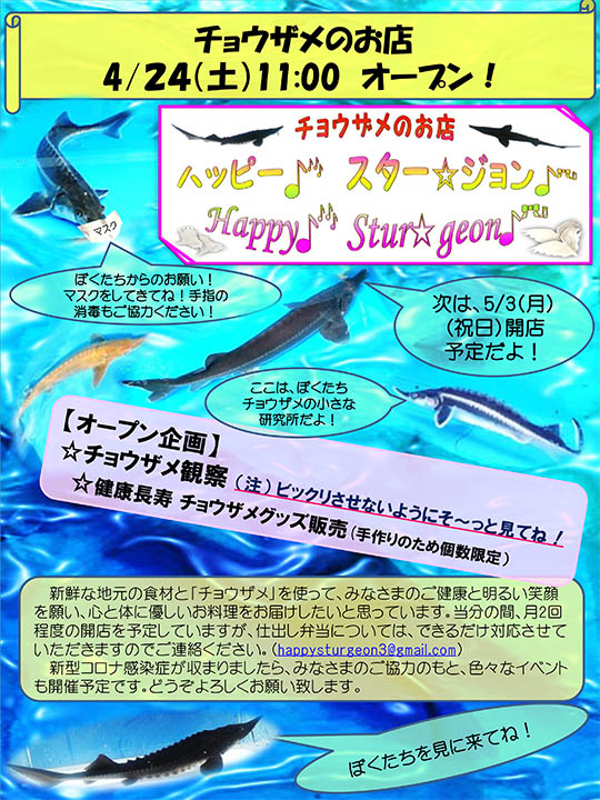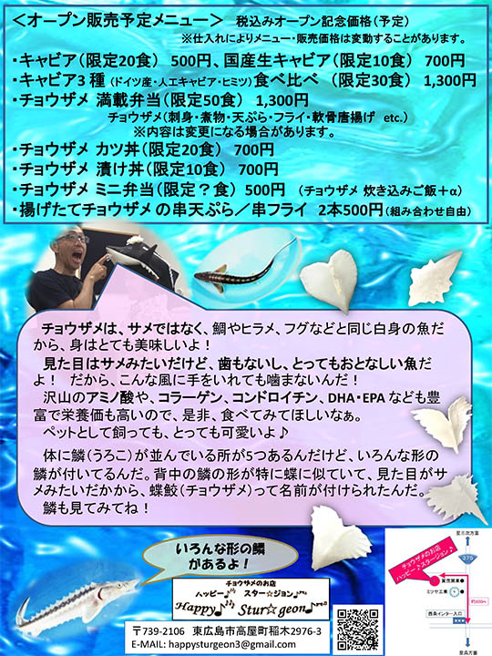 4月24日(土)、東広島市高屋町稲木に「チョウザメ」のお店がオープンします!