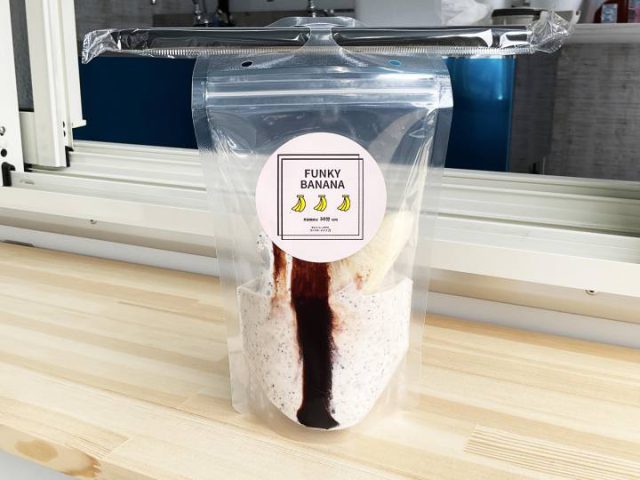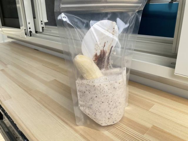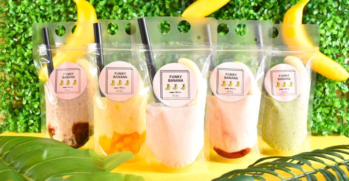 ファンキーバナナは、パックにバナナジュースとバナナ1本が入っていて、手でもみほぐしながら飲む新しいドリンク。なんともインパクトがありますね~。