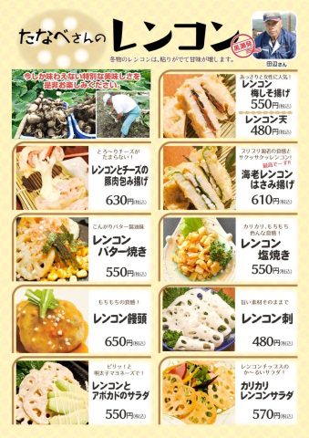 東広島市黒瀬町の「田辺さんのレンコン」を使用したメニューがずらり。