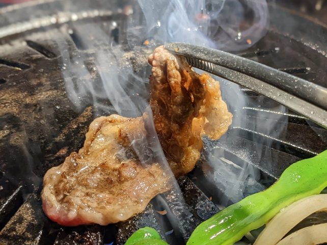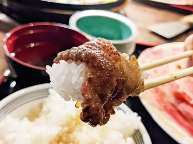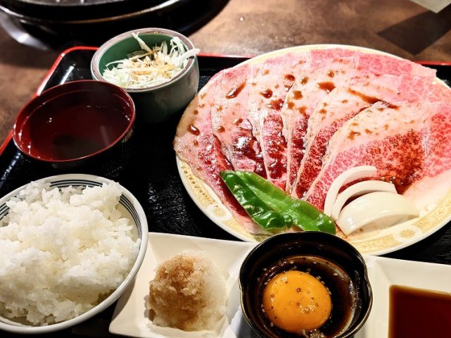 東広島のおいしい情報を紹介する「東広島グルメ」。今回は、東広島市西条町下見の焼肉牛皇(ぎゅうおう)の「月見 宮崎牛薄切カルビ御膳」を食レポします。お得情報もあわせてご紹介します。