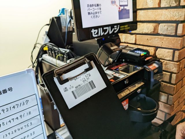支払いはセルフレジで。伝票を持って機会に読み込ませます。