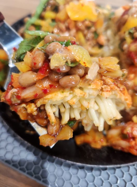 お好み焼きが見えないほど納豆、大葉、たくあん、キムチがこれでもかとかかっていて、見た目のインパクト大!色も赤、緑、黄色と色鮮やかで、食欲をそそります。