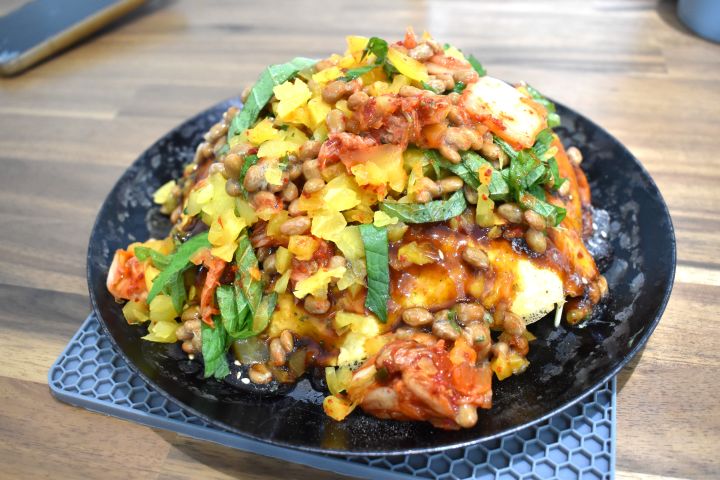口に入れるとすべての食材が口の中でマッチして相性抜群。それぞれの具材の風味が生きていて大葉のさわやかさやキムチの辛さもすべて感じることができました。納豆とお好み焼きの相性は知っていましたが、改めて食べるとめちゃくちゃ合っておいしかったです。