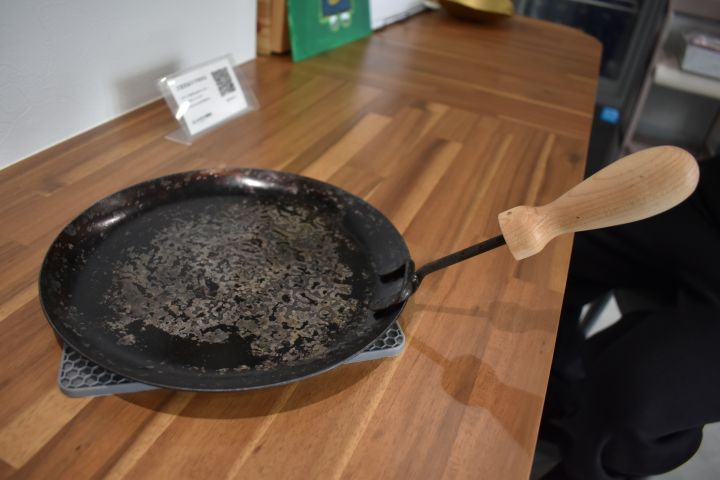 おこのみ焼きBondでは鉄板ではなく、香川県から取り寄せたフライパンディッシュという鉄板型のお皿に乗せて提供します。フライパンディッシュを使うことで、冷めにくく保温効果があるのが特徴。熱々の状態でお好み焼きを楽しむことができます。