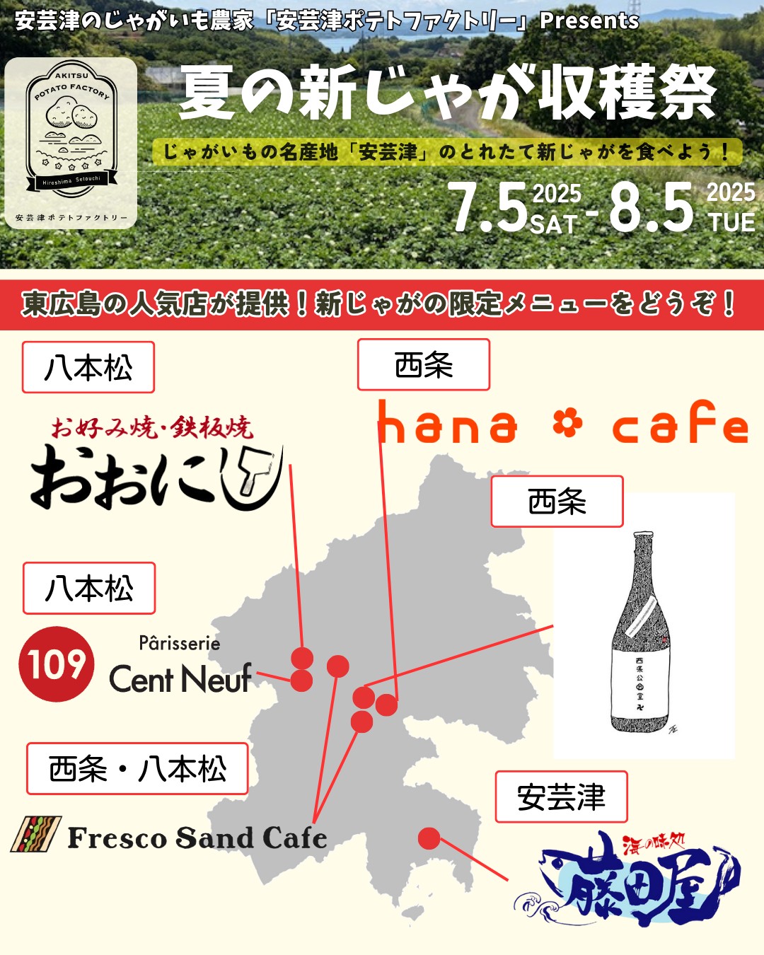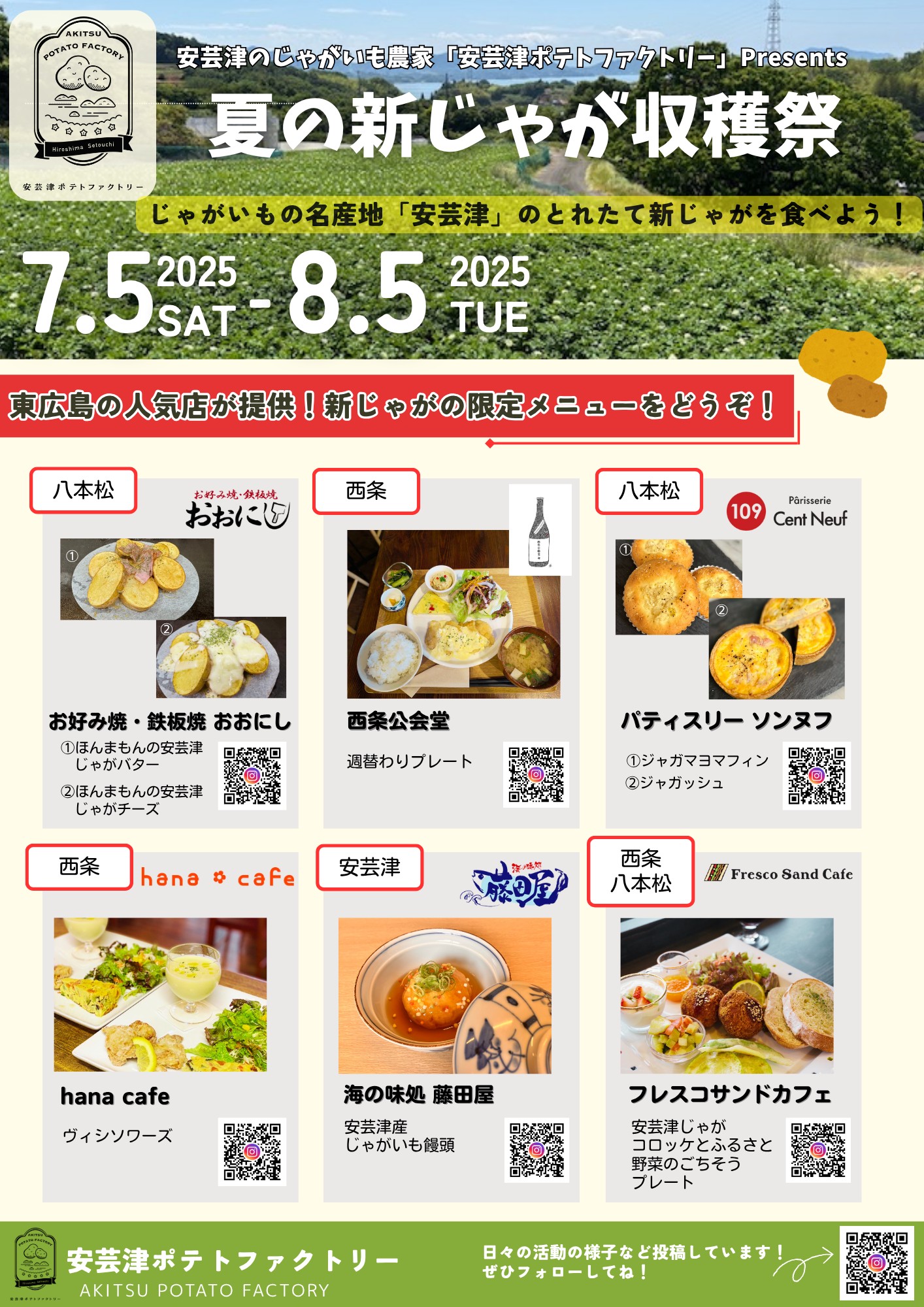 2025年7月5日(土)~8月5日(火)まで、広島県東広島市安芸津町産の「新じゃがいも」を使った食の祭典【安芸津新じゃが収穫祭】が、市内の6つの飲食店で開催されます。