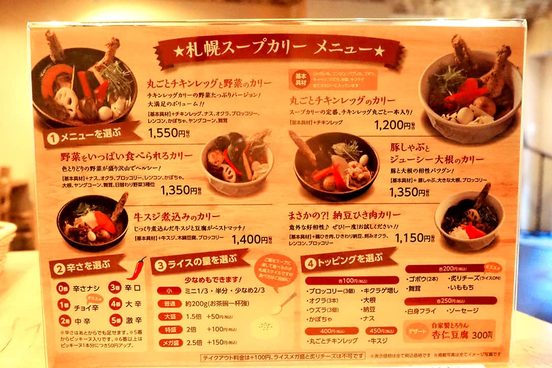 メニューは他にも、定番のチキンレッグカレーや、納豆が入った少し変わったカレーもあります。牛すじ、いももち、白身フライなど、トッピングの種類も豊富で、自分好みの味を楽しむのもおすすめです。本場の味にこだわった絶品のスープカレーをぜひ味わってください。