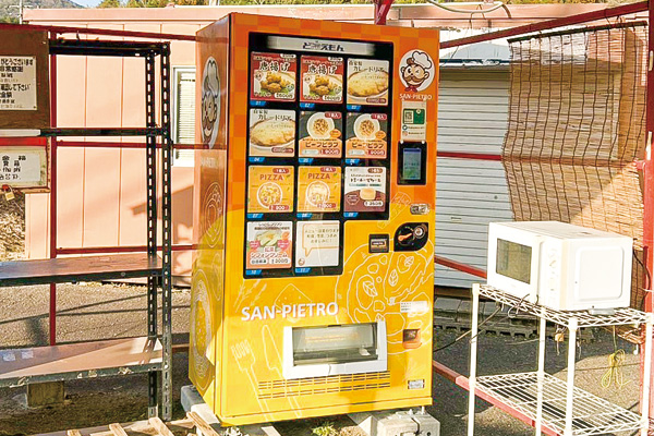 造賀の自動販売機では24時間購入可能。カレーピラフやピザなどメニューは定期的に変わる。すぐ食べられるよう電子レンジも設置されている。