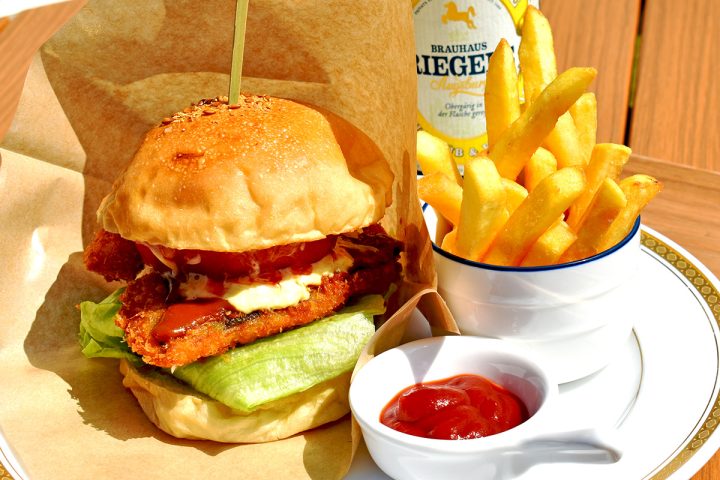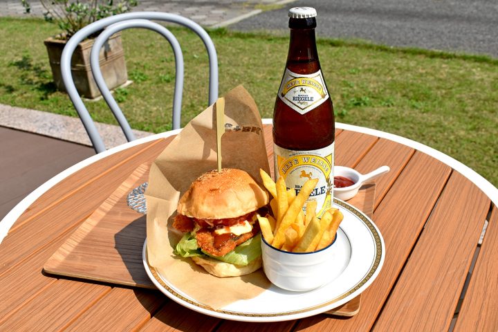 サクサクのアジフライ、厚切りトマト、レタス、みじん切りのタマネギをはさんだハンバーガー。バンズは東広島市西条のパン屋「cocoron(ココロン)」のもので、オーガニックのアーモンドミルクが練りこんであります。フィッシュバーガーはクラフトビールと一緒に食べるのもおすすめです。