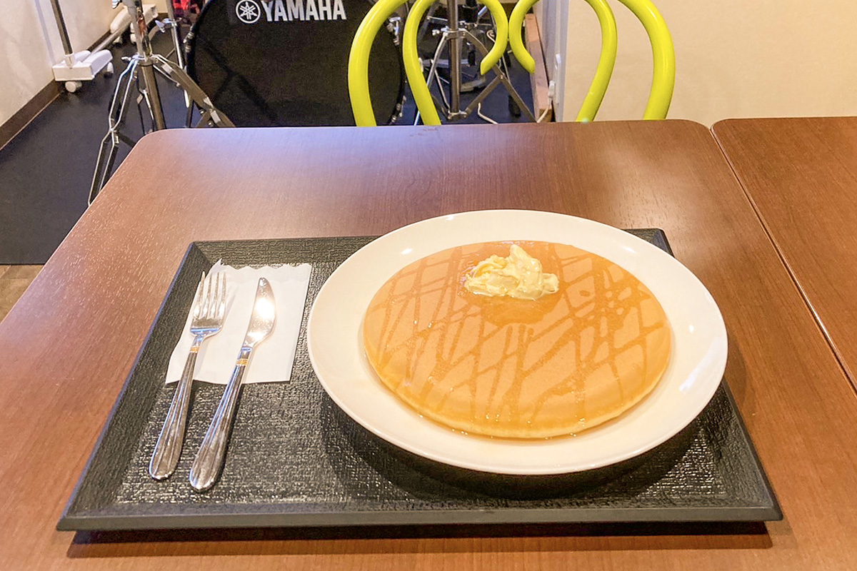 cafe REN(カフェ レン)のスイーツメニューでは、直径約20センチほどの大きなホットケーキが魅力的。ふっくらと焼きあがったホットケーキは、メープルシロップとバターがたっぷりとのっています。