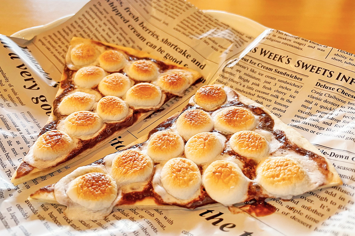 ふらっとのマシュマロピザは、チョコレートとマシュマロがとろけた甘いピザ。パリパリとした薄い生地のピザは、ランチのデザートにもぴったりです。