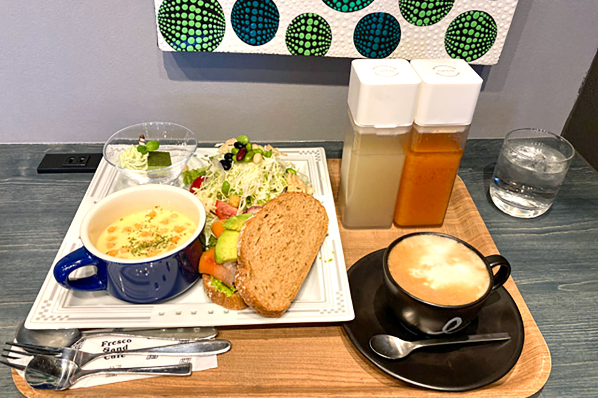 フレスコサンドカフェ八本松本店のオーダーランチは、好きな具材やパンを選んだサンドイッチが食べられるメニュー。ランチには、ドリンクと、日替わりのスープ、サラダ、デザートがついています。
