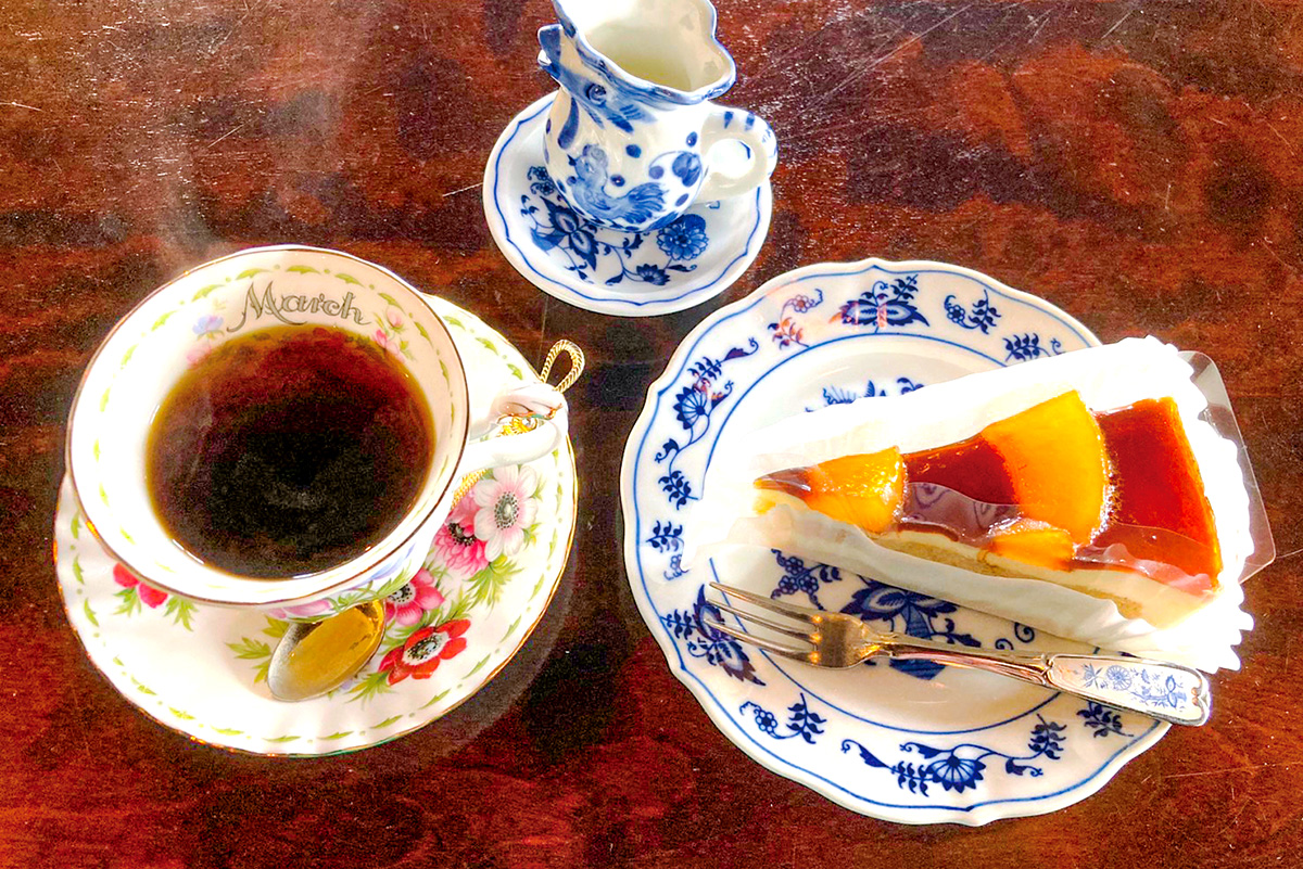 自家焙煎珈琲館のコーヒーは、苦味の中に甘さが感じられる味わい。サイフォン式で一杯ずつ抽出しています。ケーキとセットになったメニューがおすすめです。