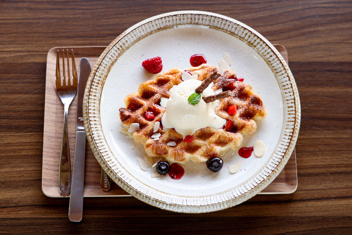 甘露cafeでは、クロワッサンとワッフルをかけ合わせたスイーツのクロッフルを提供しています。クロッフルの生地の外はカリッと、中はふわっとした食感。アイスやクランチチョコ、粉砂糖や甘酸っぱいベリーがトッピングされています。