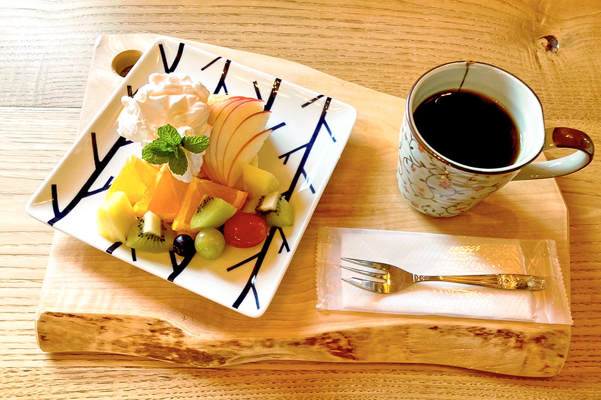 Koti-cafe(コティーカフェ)のシフォンケーキは、自家製の生クリームと季節のフルーツがトッピングされたスイーツ。シフォンケーキは、八本松のケーキ屋「パティスリーソンヌフ」のものを使用しています。