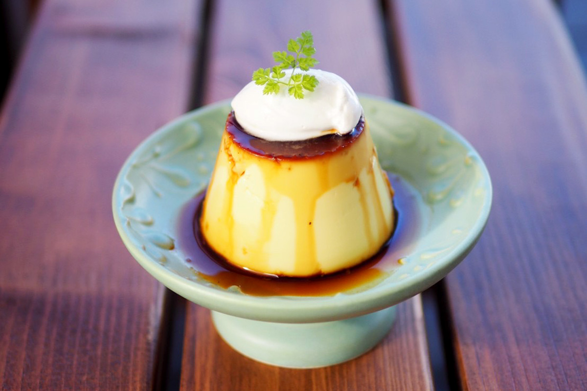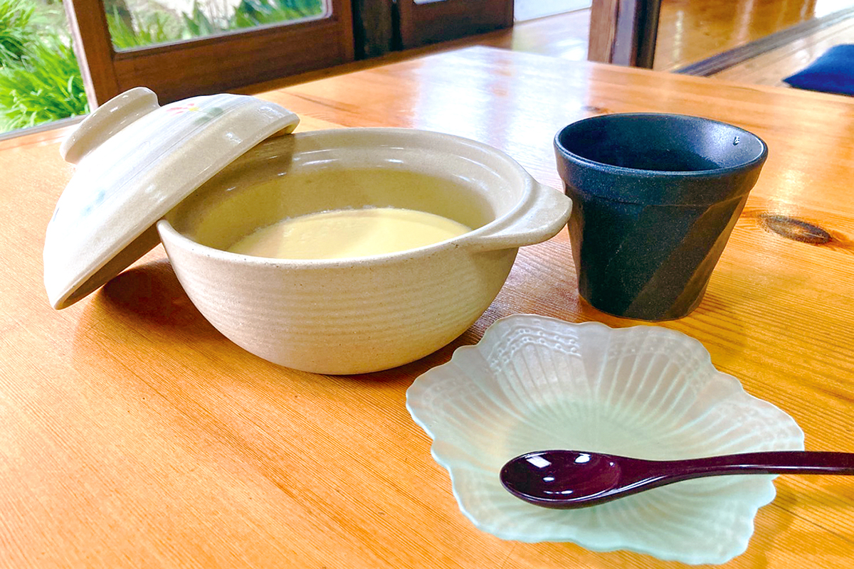 郷のえき 山城の土鍋プリンは、直径20センチほどの土鍋に入った数量限定のメニュー。なめらかで飽きのこない味の手作りプリンです。