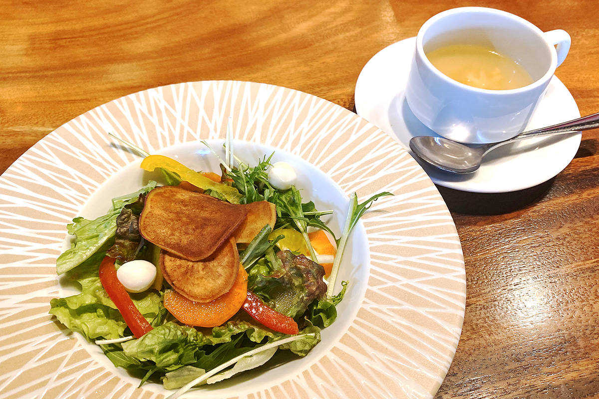 cafe bar THE EARTH(カフェバー ジ アース)のランチは、10種類の中からメイン料理が選べるメニューや、チキンやトンカツのメニュー、牛肉の料理のメニューなどの3種類。それぞれのメニューには、サラダ・スープ・ドリンクがついています。