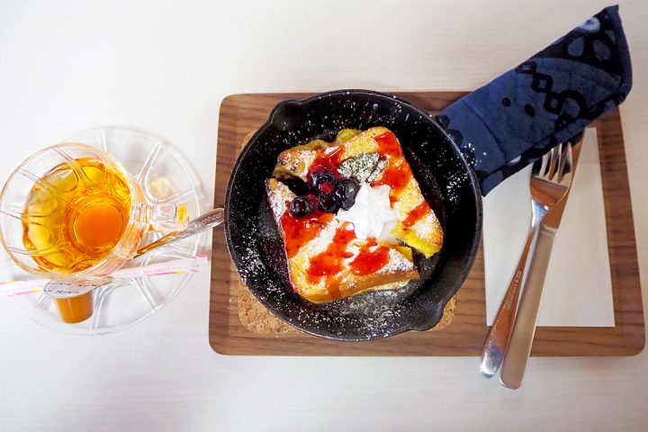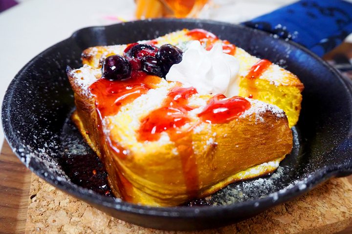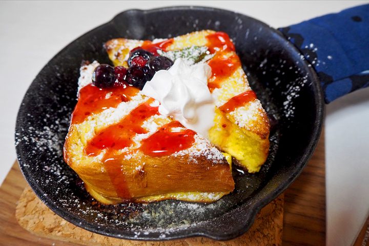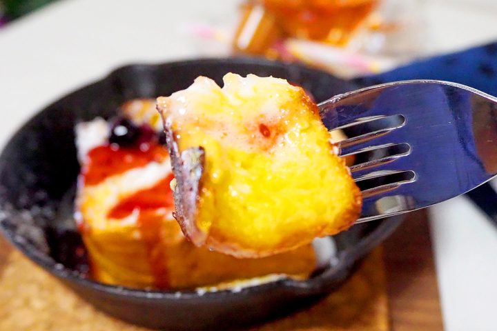 フレンチトーストはスキレットで提供しているため、焼きたてで熱々です。トーストにかかっているベリーのソースがふつふつとしていました。