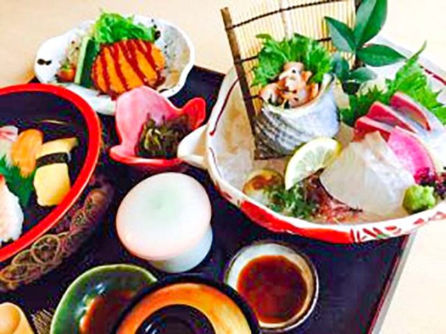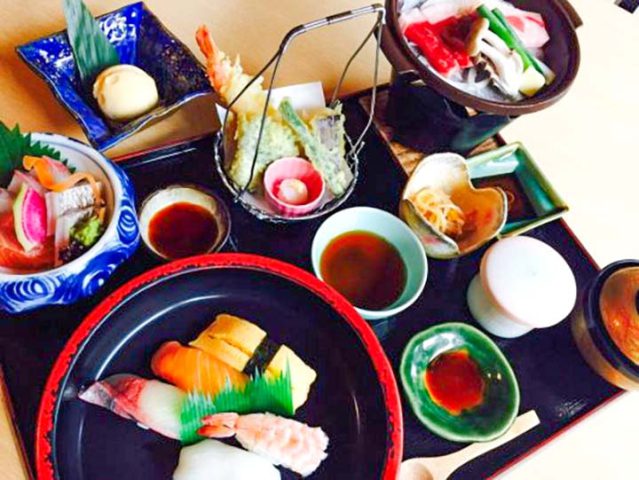 藤田屋の豪華なおすすめメニュー。お寿司に、天婦羅、刺身に陶板焼き、デザートの豪華なお膳は夜も注文可能。