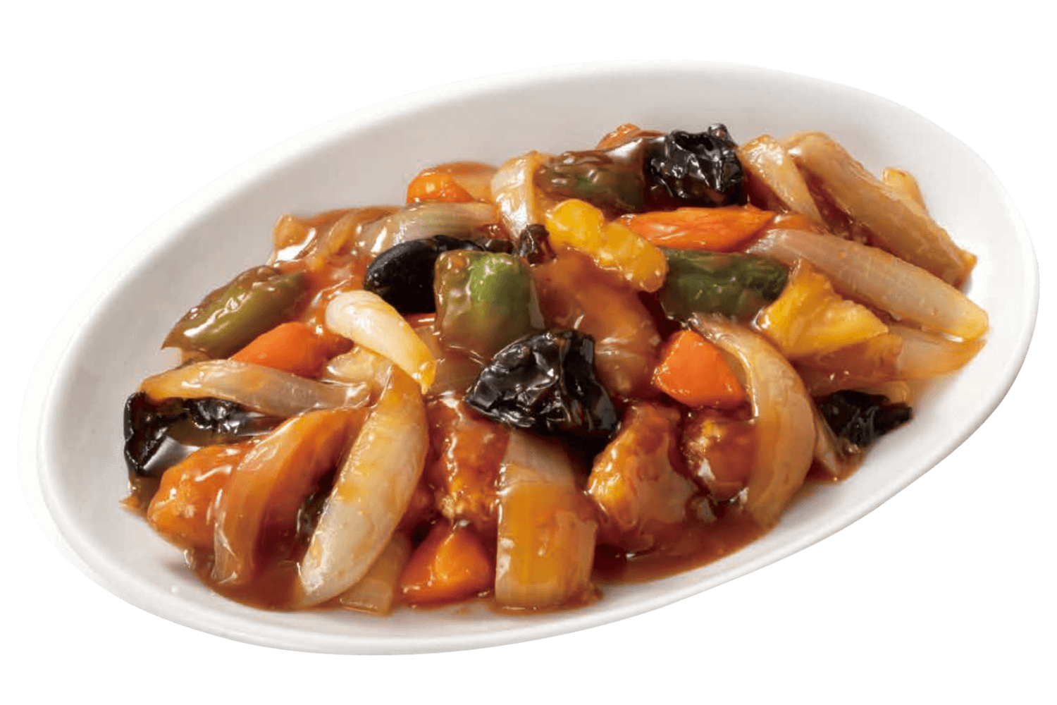 カラッと揚げたジューシーな豚肉と色とりどりの野菜に濃厚で酸味が特長的な黒酢タレをたっぷりまとわせました。
