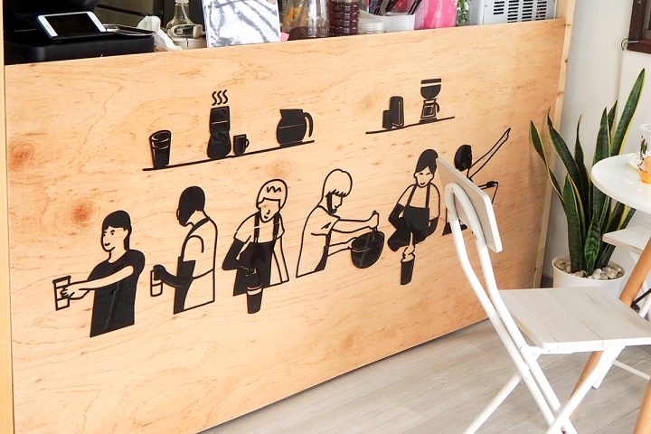 木のカウンターにミルクティーを淹れる様子がイラストされているのがおしゃれ!