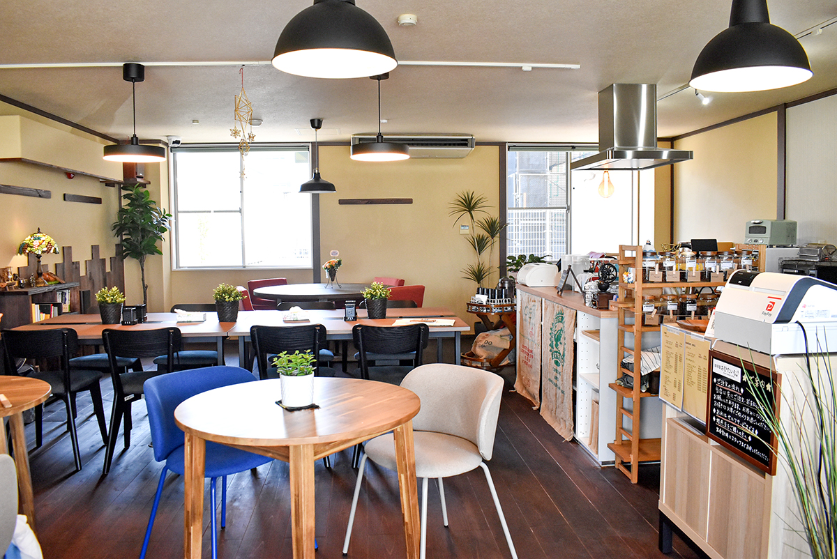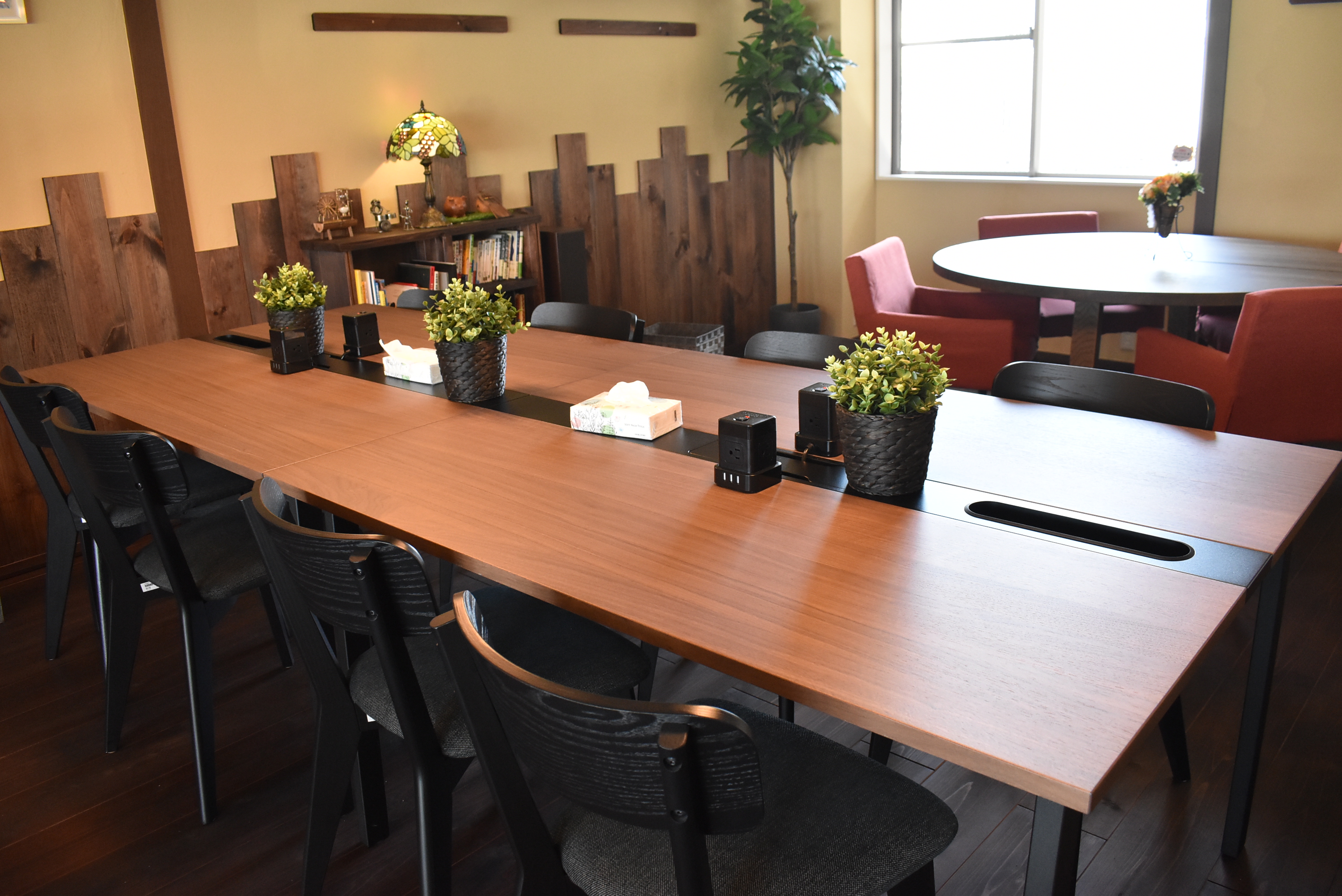 店内は木の温もりを感じる落ち着いた空間で、ジャズ好きの店主こだわりのスピーカーからジャズのBGMが心地よく流れます。4人掛けのテーブル席、パソコン作業ができるUSBポート付きの席など、多彩な座席があり、一人でもグループでも利用しやすいカフェです。