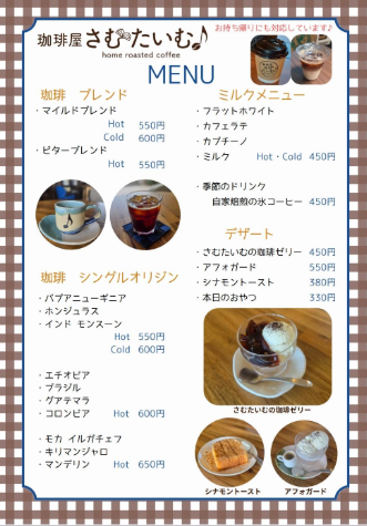 珈琲屋さむたいむのドリンクメニューは他にも、ブレンドコーヒーやカフェラテなど種類豊富。デザートはコーヒーゼリーやアフォガード、シナモントーストなども提供しています。