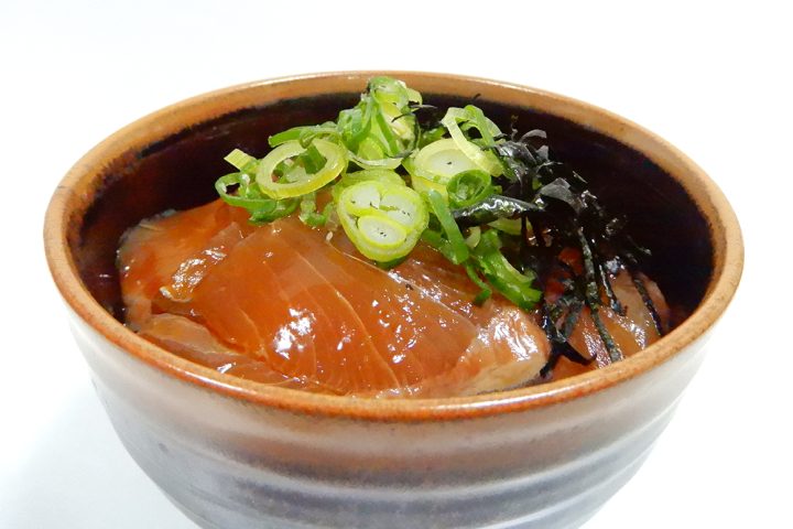 東広島市安芸津町の「大浦鮮魚店」は、従業員のまかないとして人気だった漬け丼を商品化。漬けダレに一人前のネタ(かんぱち・安芸津産のタイ・サーモン・イカ・マグロのいずれか)を漬け込んだ「魚屋の漬け丼の素」をご飯の上にのせて味わうテイクアウトメニューです。
