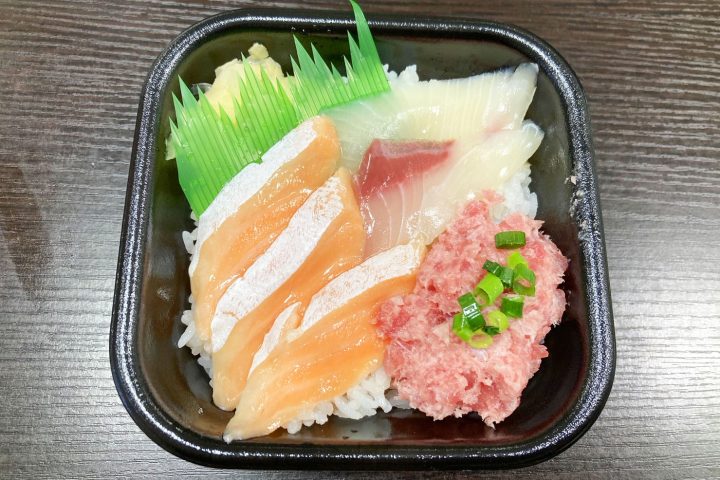 東広島市西条下見、ゆめタウン学園店近くの「丼丸こねこ 西条下見店」は、テイクアウト専門の海鮮丼店。「ブリトロ丼」は、人気のネタのブリ、トロサーモン、ねぎトロがのっています。
