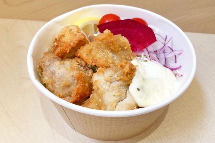 東広島市西条町寺家、道の駅西条のん太の酒蔵の「リストランテファミリア」の「コメカラ丼」。国産の鶏肉に西条酒で下味をつけ、米粉で揚げた東広島のご当地グルメのコメカラがのっています。