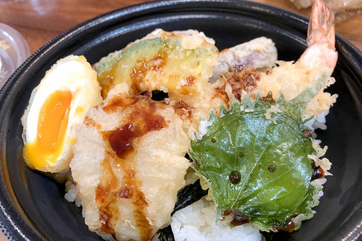 東広島市西条の「天-てん」は、天ぷらを中心としたメニューを提供する店。テイクアウトの「天丼」は、大きなエビや野菜の天ぷらが味わえます。