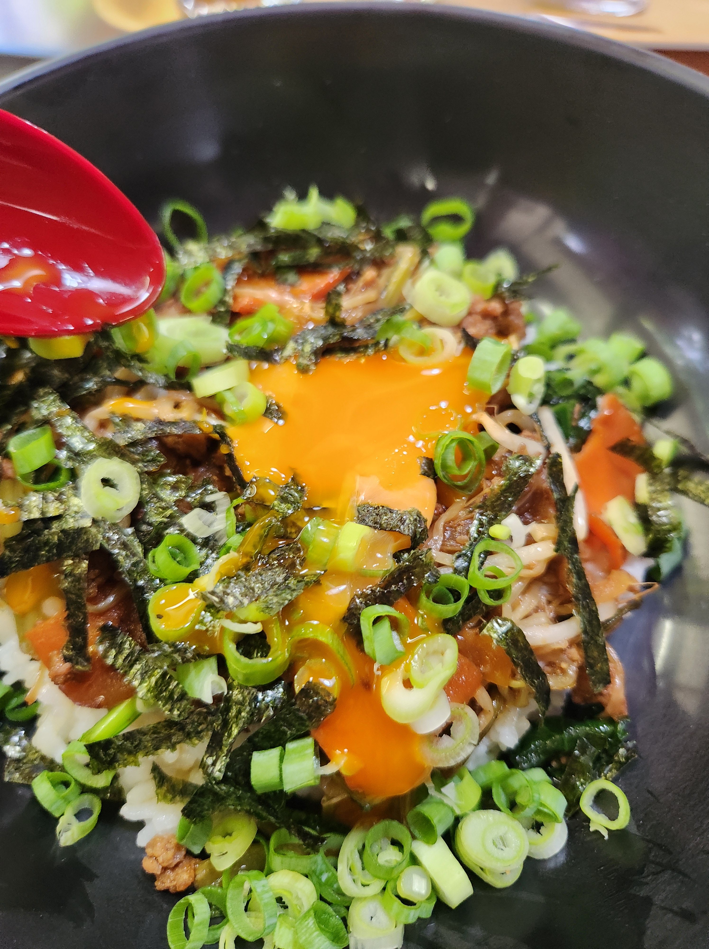 筆者は辛いものが好きなので、ラー油をたっぷりかけていただきました。甘辛い味付けの野菜とひき肉が、卵黄のまろやかさと絶妙にマッチして、ご飯がどんどん進む味わいです。