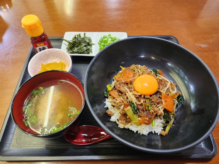 看板メニューは「えみまる丼(1000円)」。甘辛く炒めたひき肉とたっぷりの野菜をご飯にのせ、中央には卵黄をトッピング。お好みで薬味やラー油を加えて味変も楽しめます。付け合わせには、豆腐と油揚げが入ったみそ汁がついてきます。
