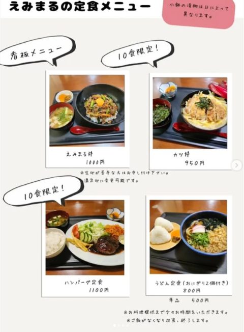 「cafe えみまる」では、丼ぶりや定食などのランチメニューのほか、軽食やデザートも充実。メニューは全て一つ一つ丁寧に手作りしています。
