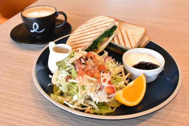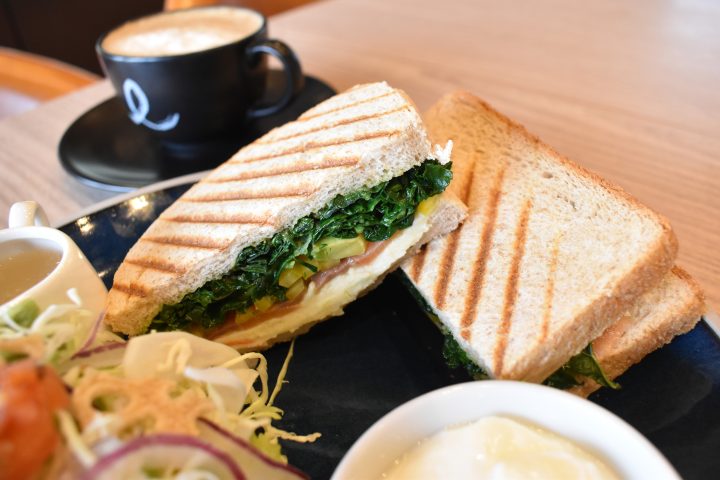 サンドイッチはケールとサーモンが入った全粒粉パンのホットサンド。ケールは東広島市高屋の「ALLGREEN(オールグリーン)」のもので、約25グラムも入っているそう。サンドイッチには、風味のアクセントとしてバジルのソースを使用しています。