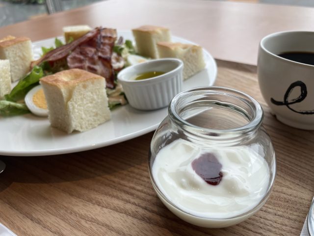 フォカッチャとサラダのプレート、ヨーグルト、選べるドリンク付き。(注文はホットコーヒー)