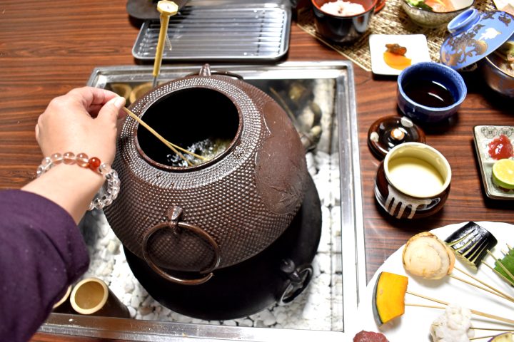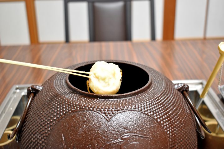 茶釜での天ぷらは、自分で好きな食材を選びながら、好きなタイミングでゆっくりと味わうことができます。