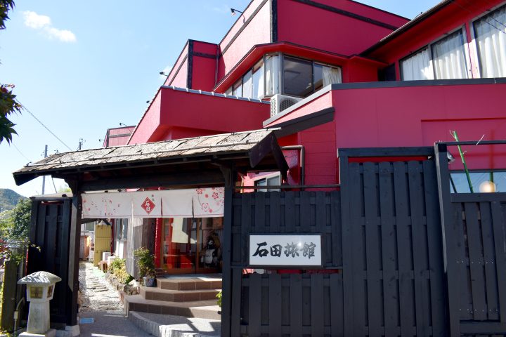 石田旅館は、東広島市八本松飯田のJR八本松駅から徒歩3分の場所にある、赤色の建物が目印の旅館です。和室は14室、洋室が3室ある旅館では、宿泊以外にも、会席料理の食事のみを楽しむこともできます。