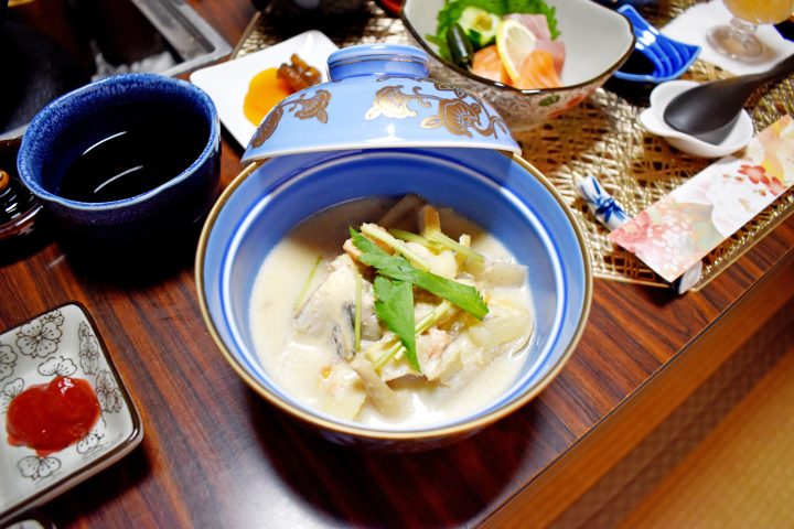 西条の酒かすを使ったかす汁はたくさんの根野菜が入っていました。ほんのりと甘く、まろやかな味わいの一杯です。